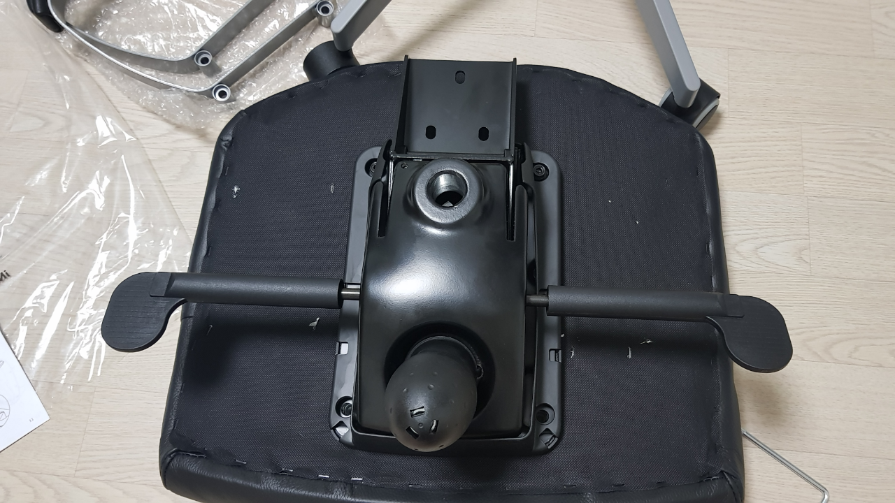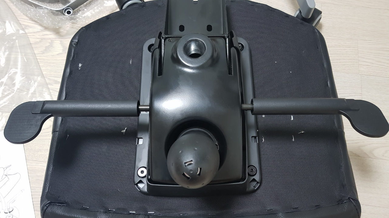 좌판과 등판을 결합한뒤, 바퀴부분과 결합했습니다. 그냥 들어서 얹으면 끝입니다. 책상높이가 낮아 팔걸이가 안들어갈 것 같으시면 이대로 사용하시면 될 것 같습니다.